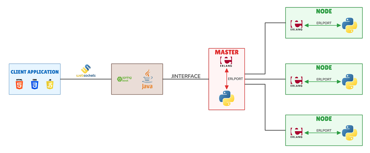 The Spring Boot backend bridges the administrator UI and the Erlang master via JInterface. Two always-running threads implement a Consumer-Producer pattern over BlockingQueue objects: WebSocketForwarder broadcasts Erlang messages to all active WebSocket sessions, while ErlangController consumes UI commands and dispatches them to Erlang.